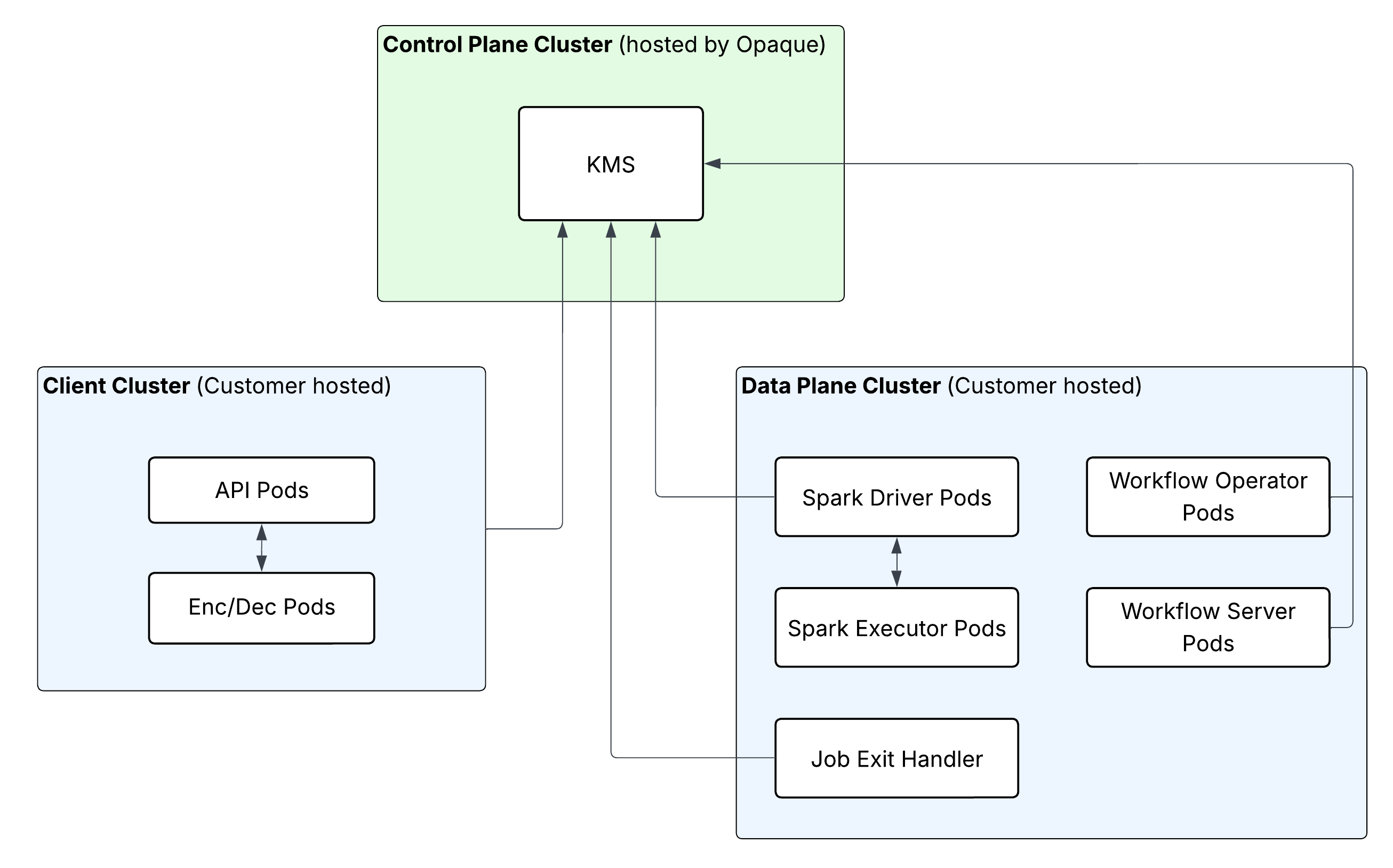 - Between customer-hosted services and control plane key management. OPAQUE’s key management services (KMS) live in the control plane. When client plane services request keys, they authenticate in the context of the user. When data plane workload services request keys, they authenticate using workload identity verified via aTLS. This helps ensure keys are released only to the intended, verified components.