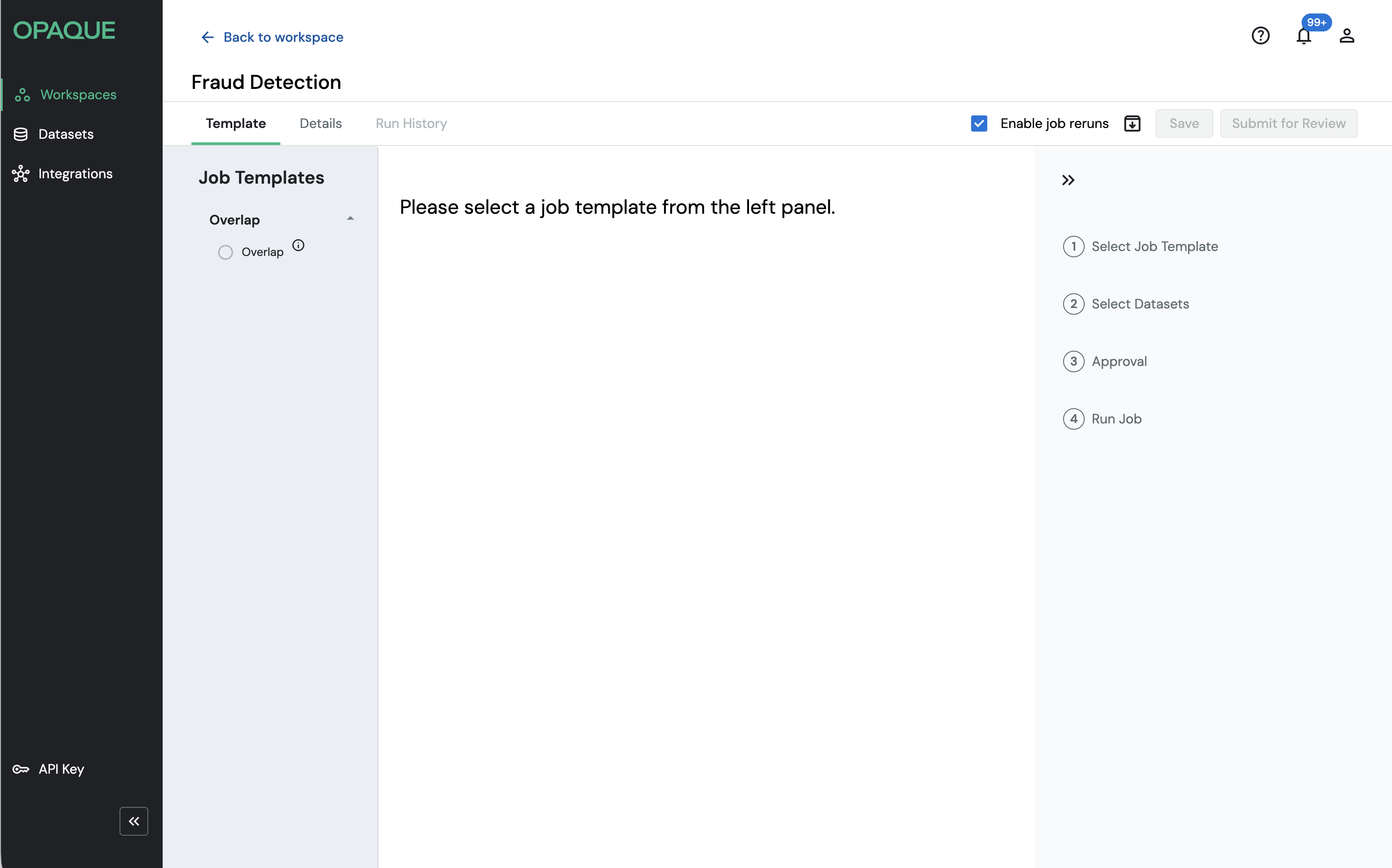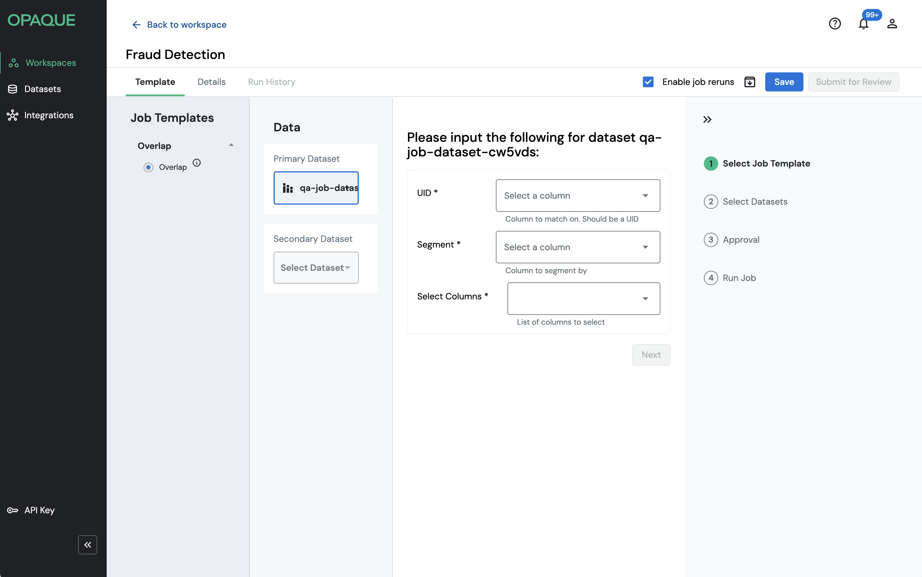 This guide walks you through creating, configuring, and running a no-code job using the Overlap template — the available job template in OPAQUE.