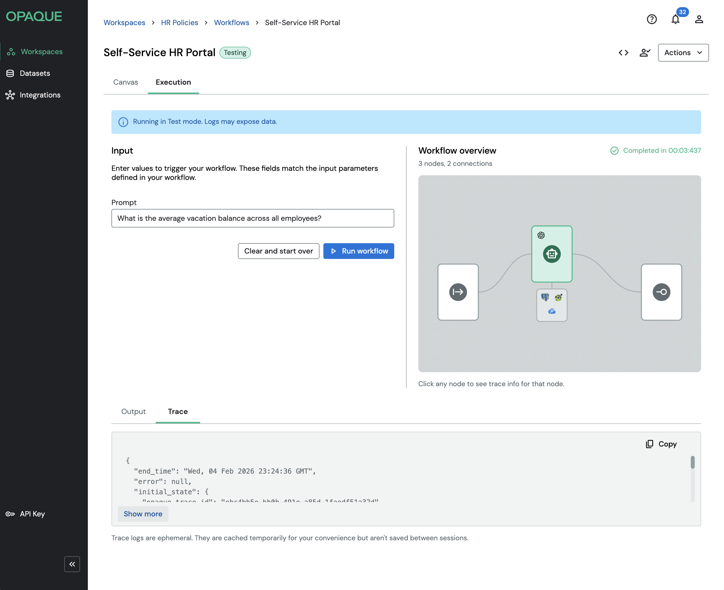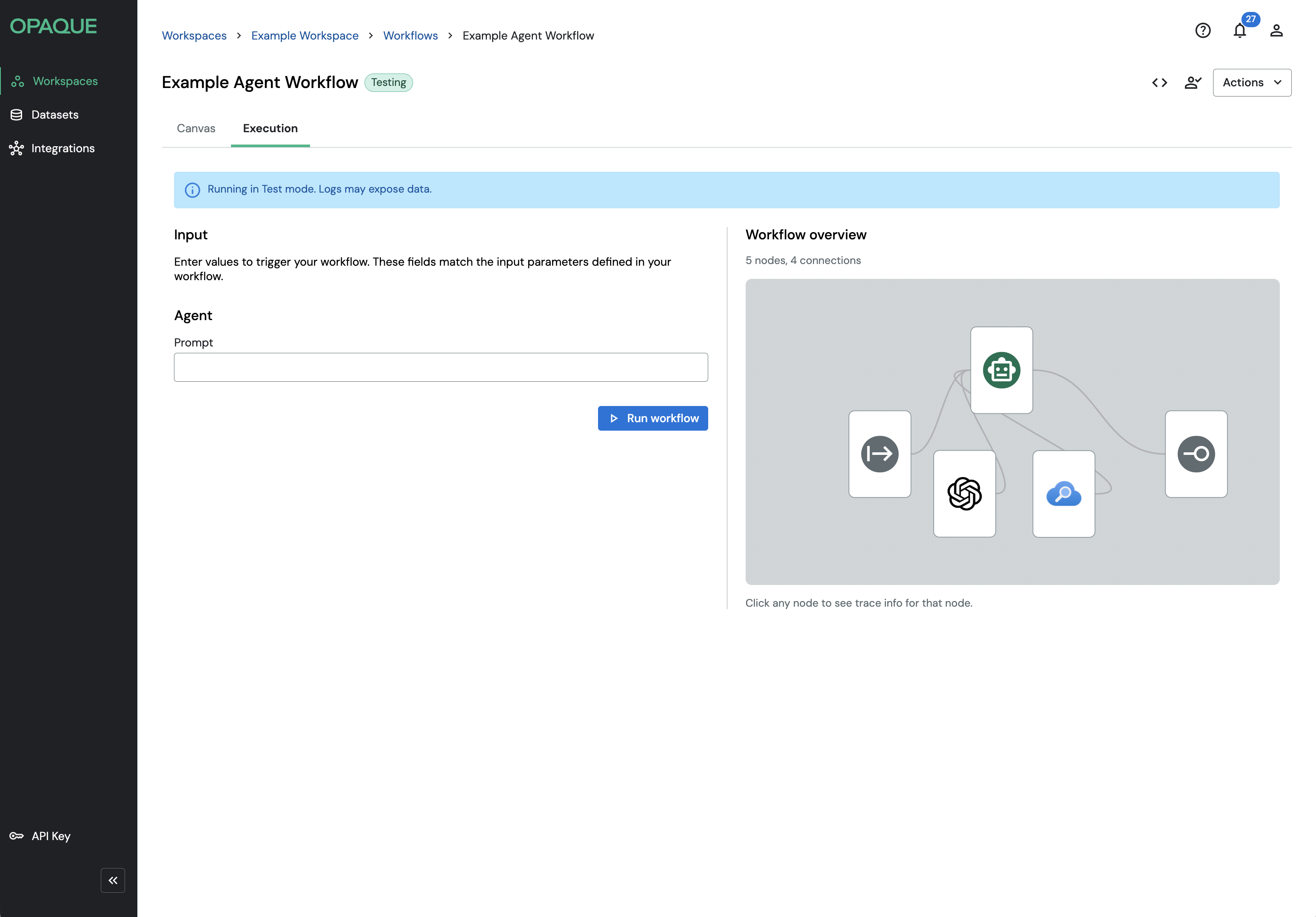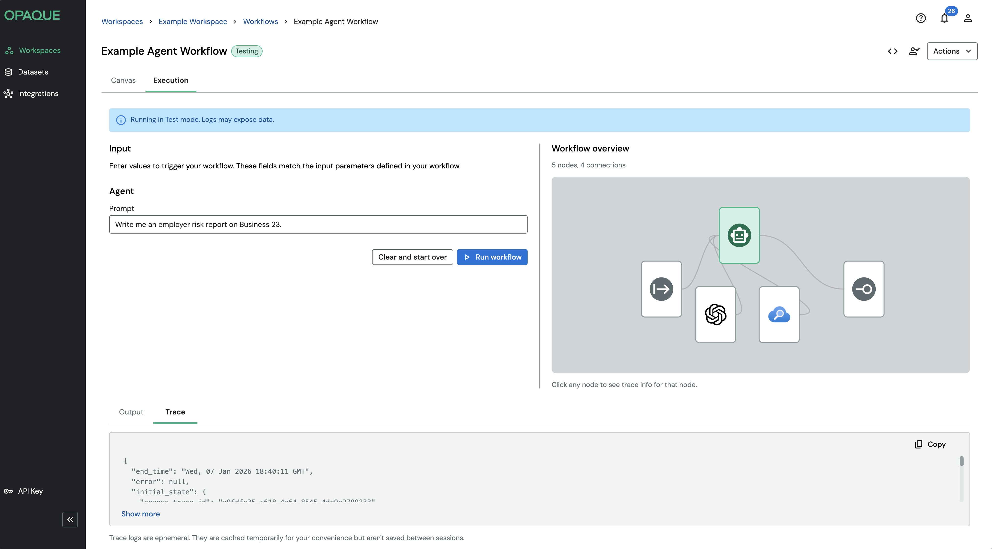 Test mode lets you inspect, debug, and validate workflows before running them in production. When enabled, OPAQUE provides detailed execution traces that show how data moves through each node and how decisions are made at runtime.