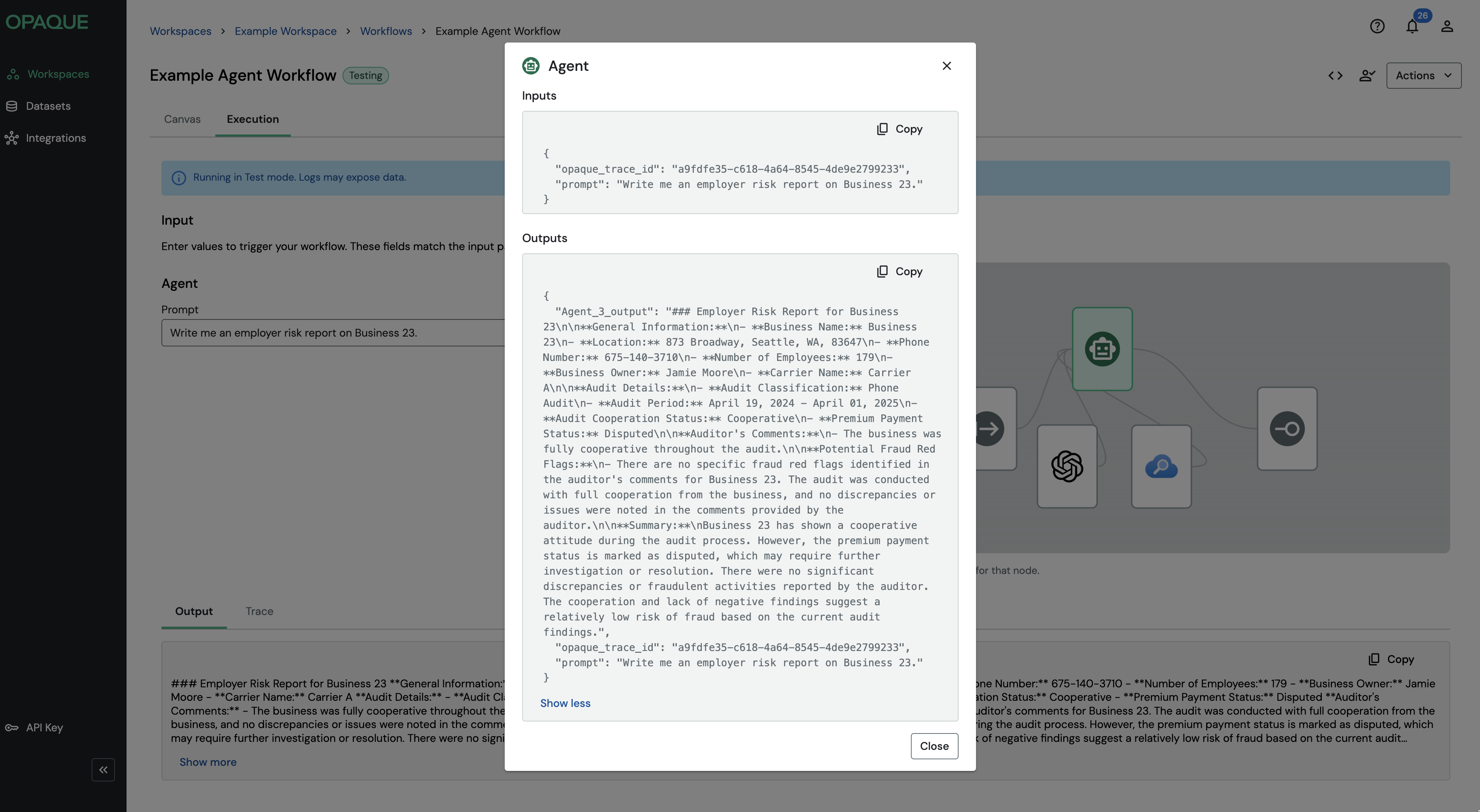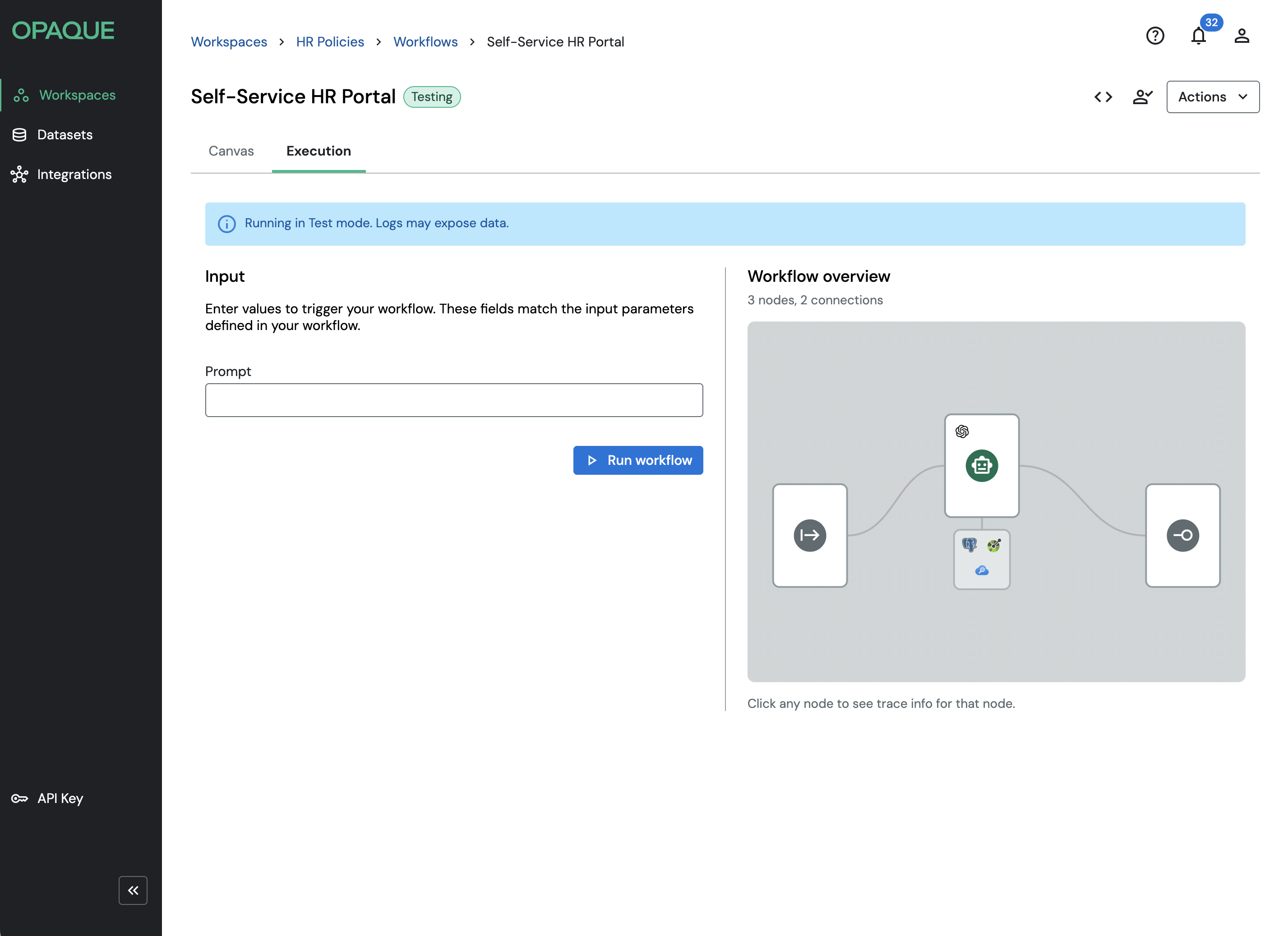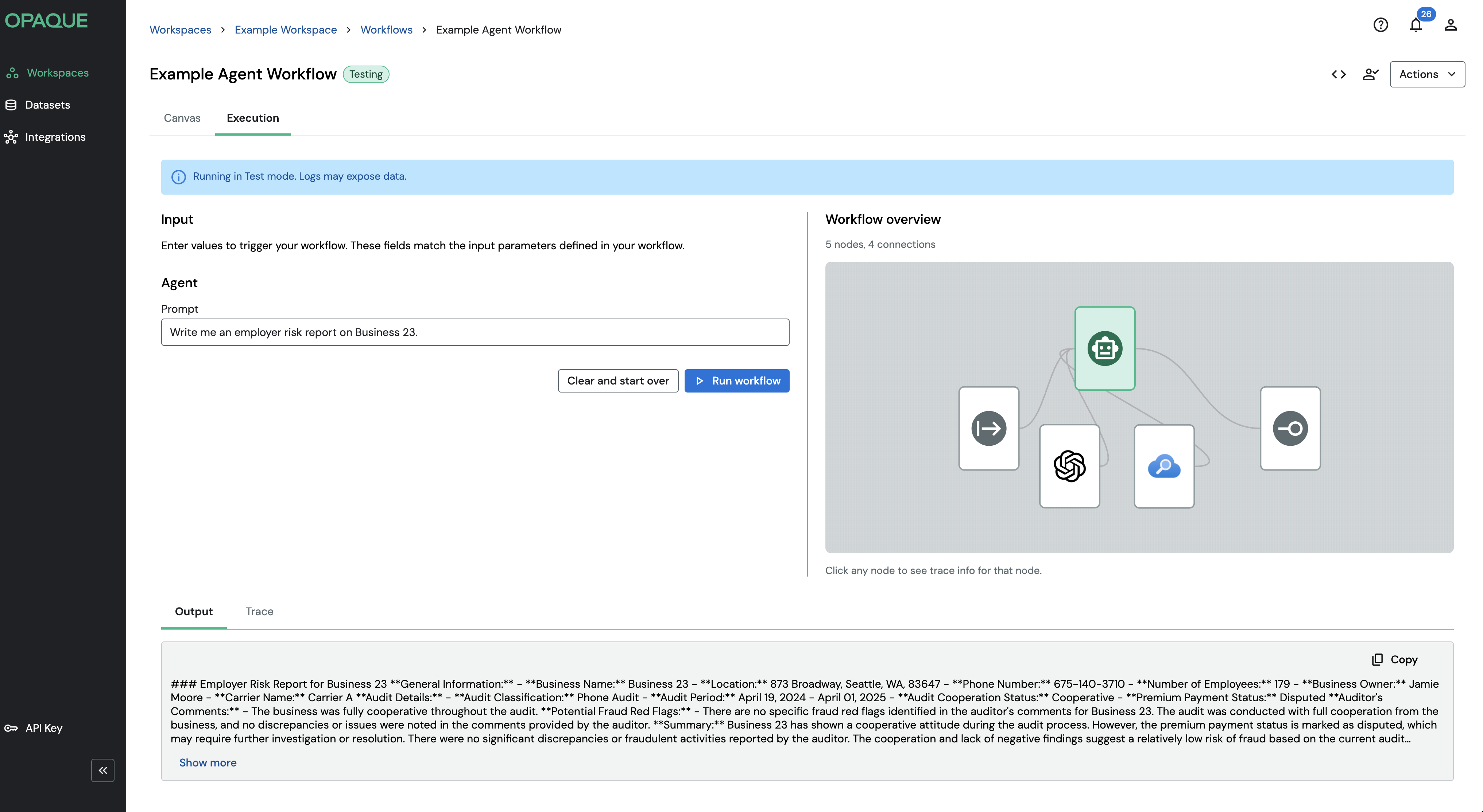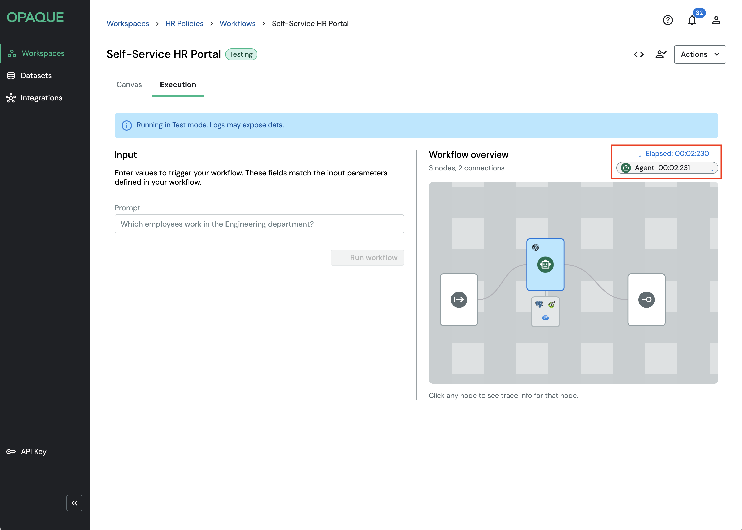 Test mode lets you inspect, debug, and validate workflows before running them in production. When enabled, OPAQUE provides detailed execution traces that show how data moves through each node and how decisions are made at runtime.