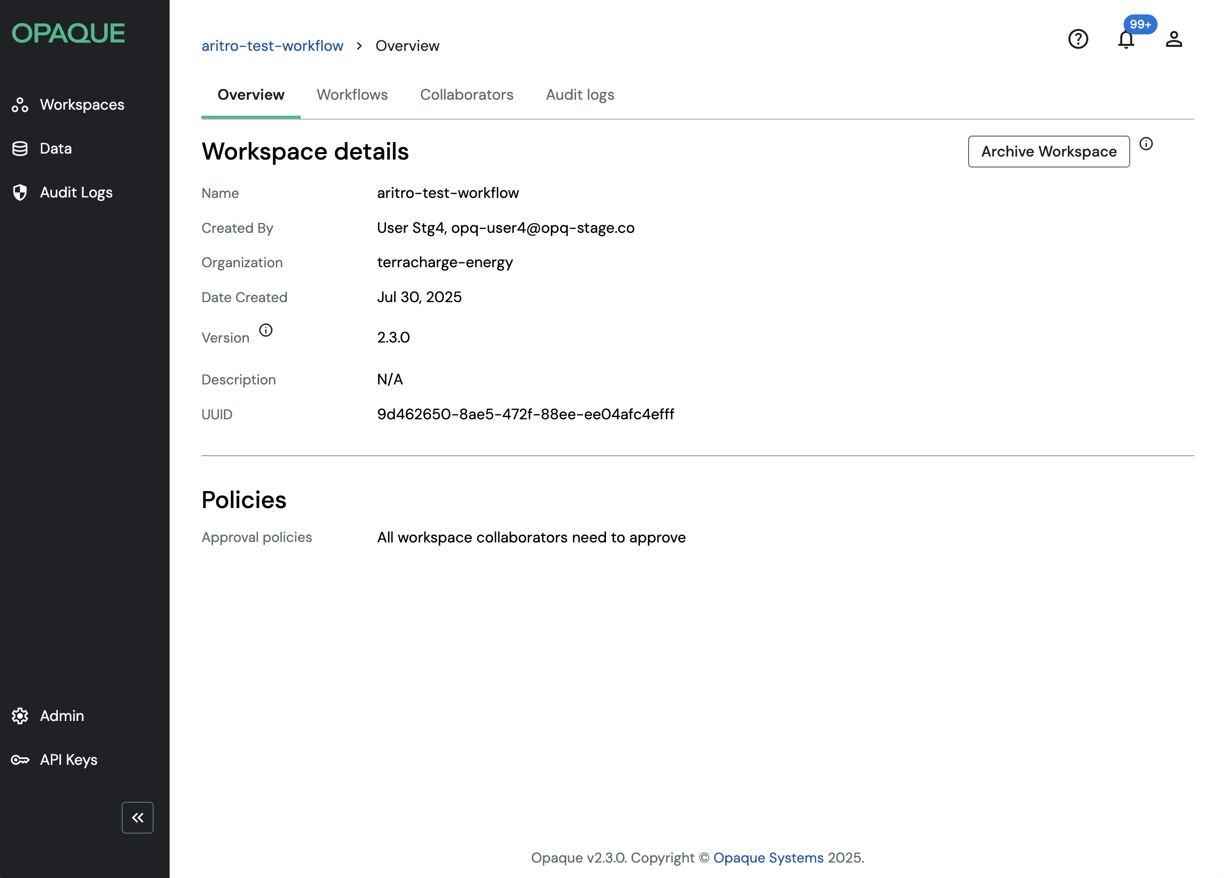 In Opaque, a workspace is a secure environment where teams can build and run workloads over sensitive data—without ever exposing that data. Workspaces isolate users, data, and logic, ensuring that each team operates within clearly defined security and policy boundaries.