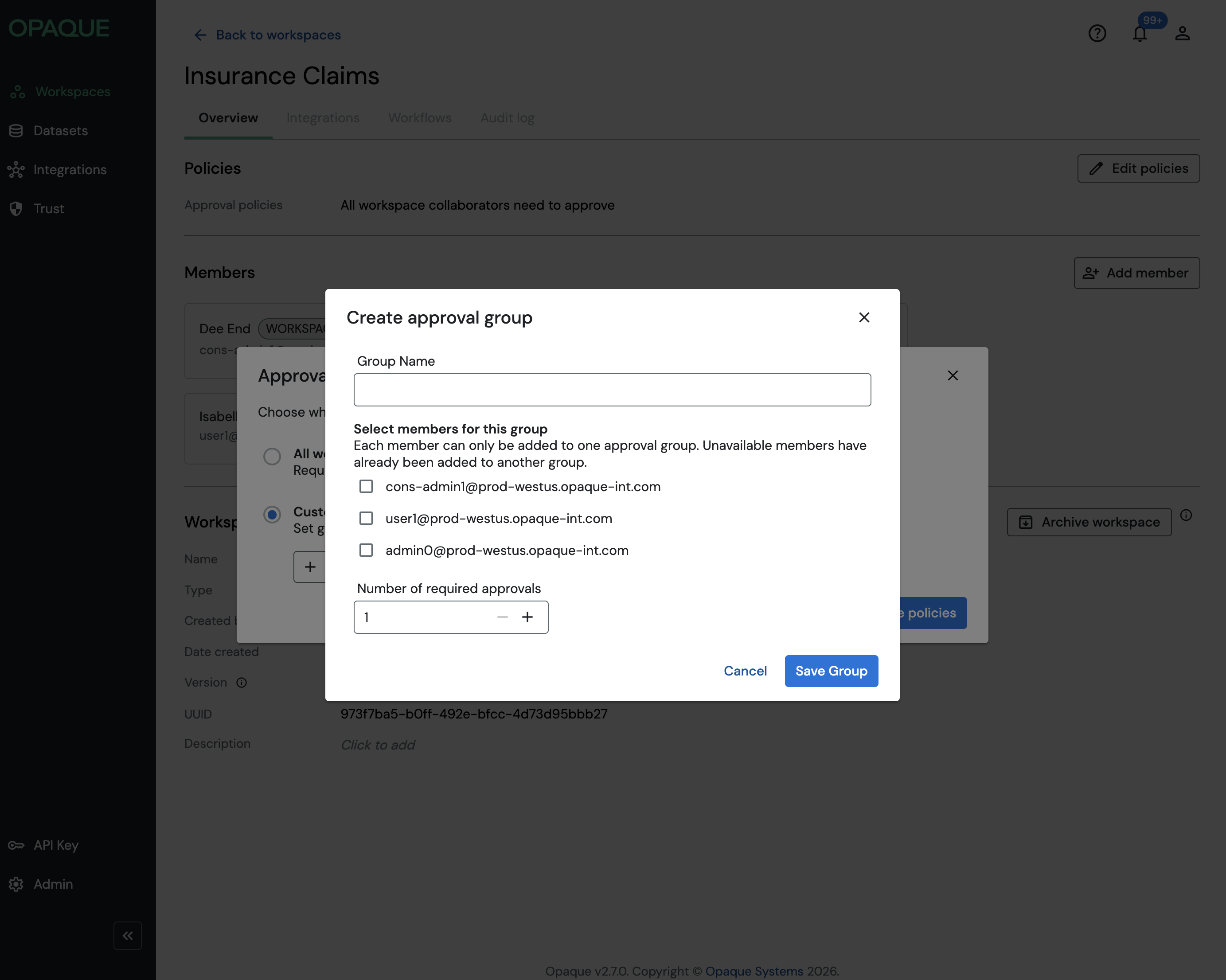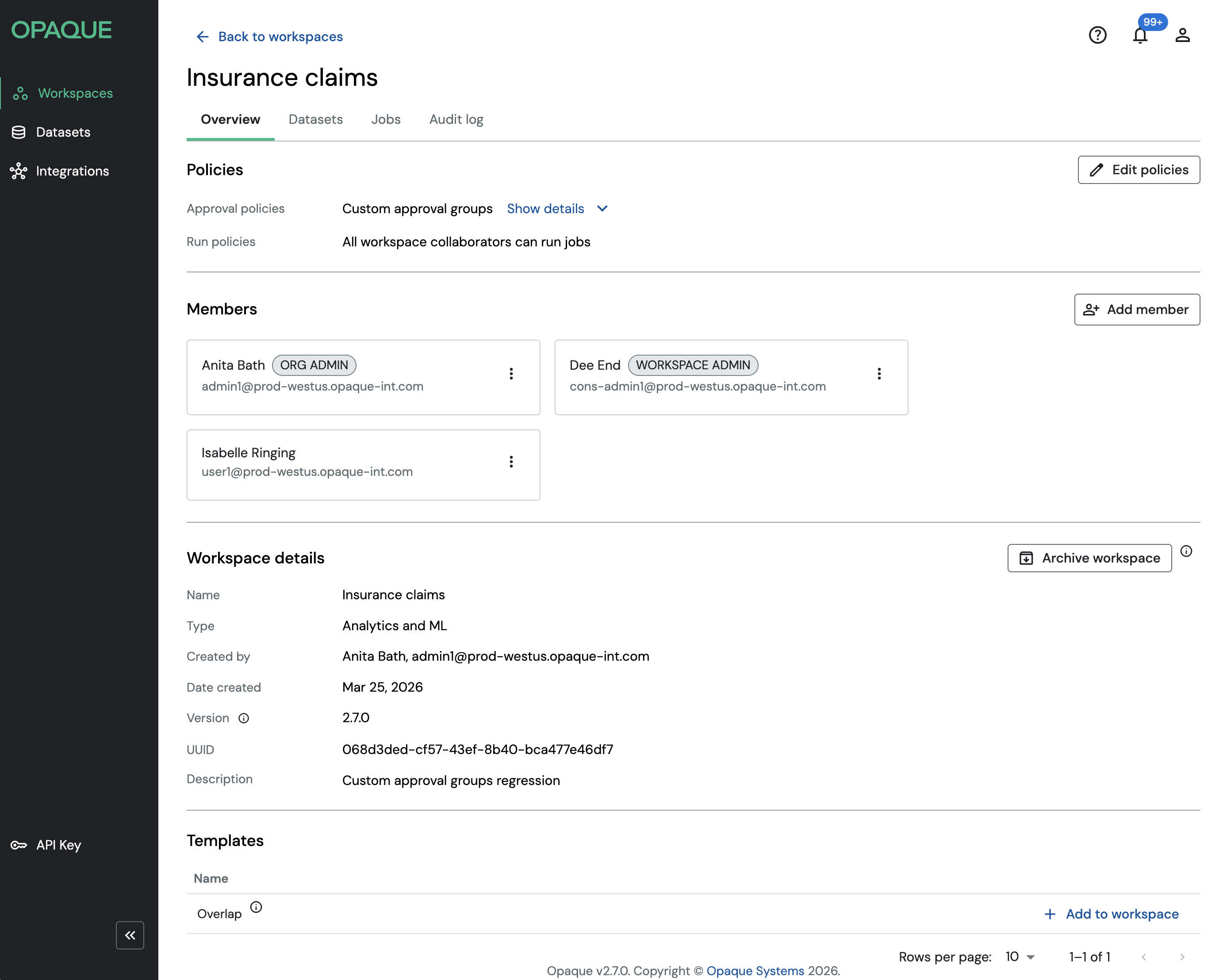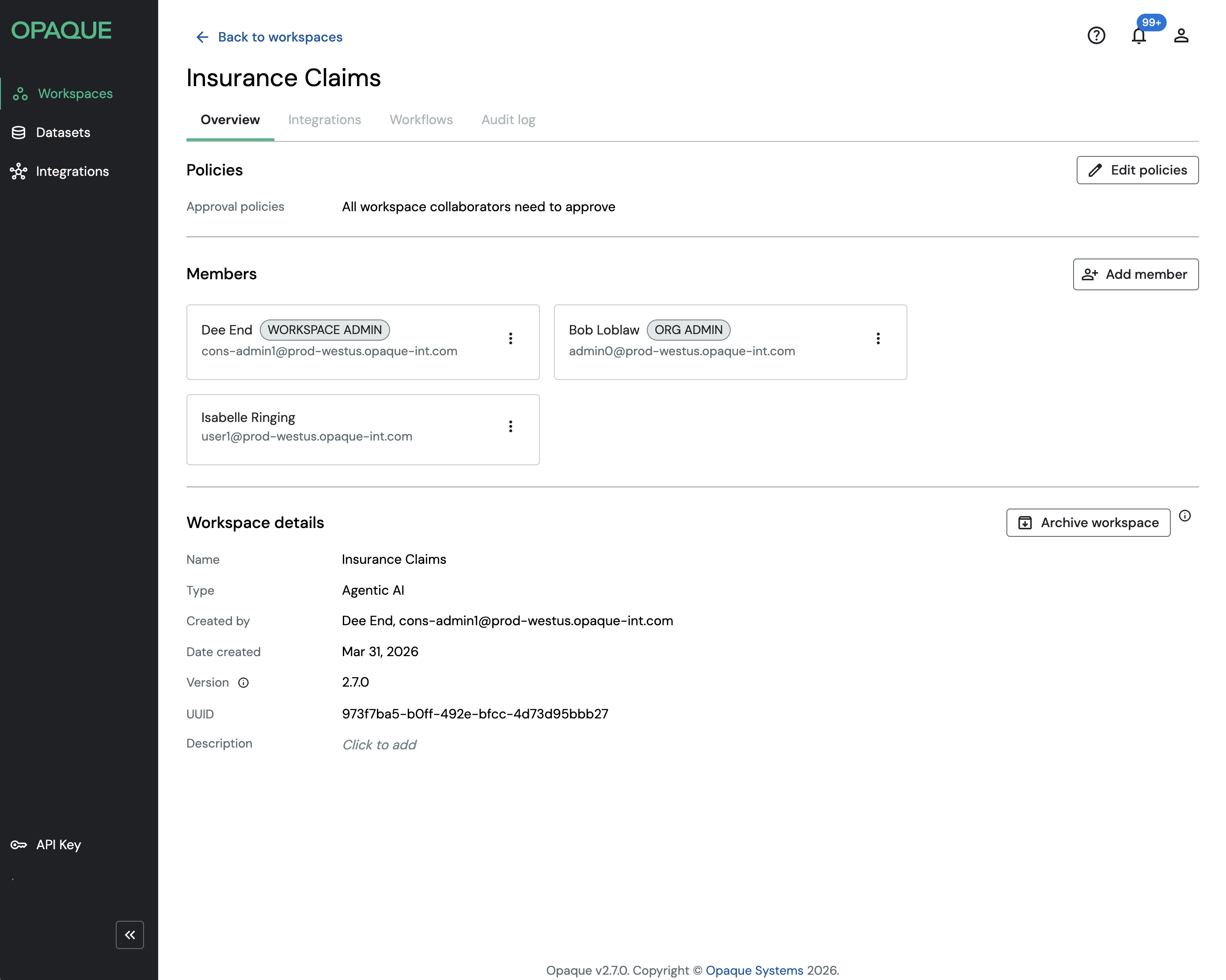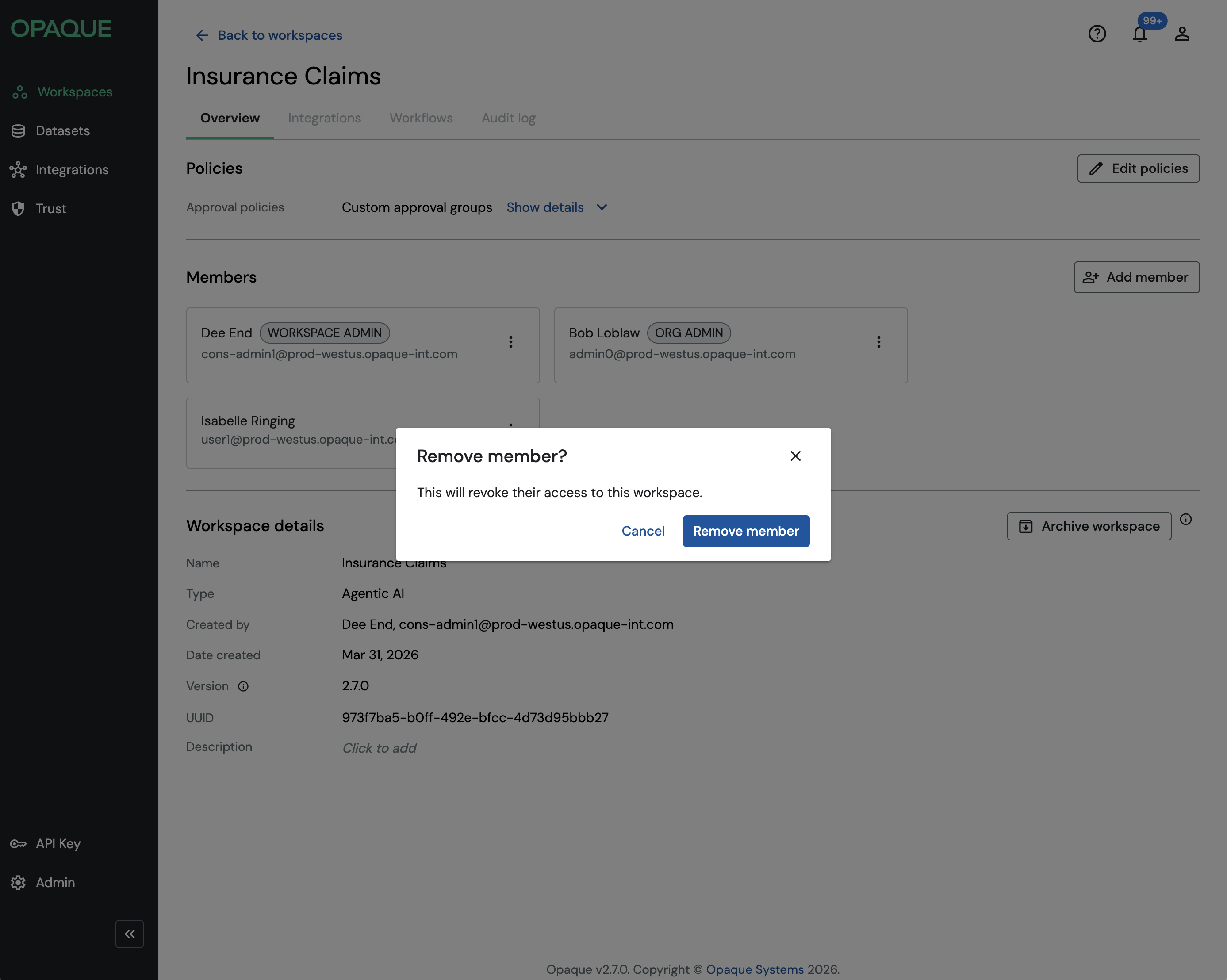 Unlike earlier versions of Opaque, you can update workspace members and policies at any time. All changes take effect immediately, ensuring that access and execution reflect the latest workspace configuration.