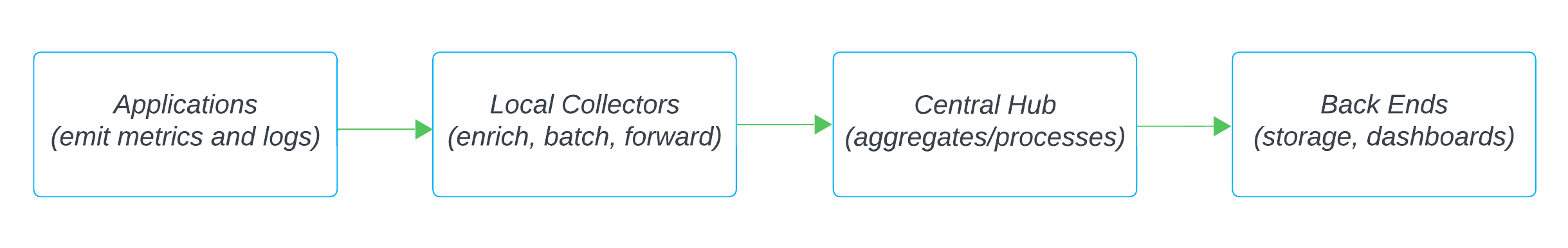 - A central hub aggregates telemetry. Collectors across the environment forward their data to a centralized service that unifies streams from many applications. This hub can apply additional processing and then route telemetry to one or more destinations.