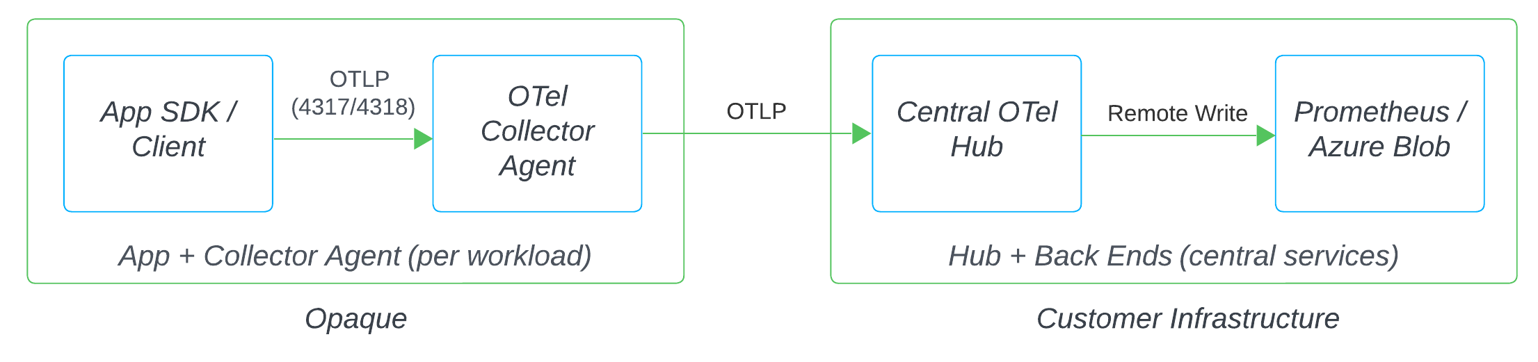 4317) or HTTP (4318). - OTel collector agents (bundled with the Opaque deployment and running as sidecars or node-level agents) receive telemetry from applications and forward it using the