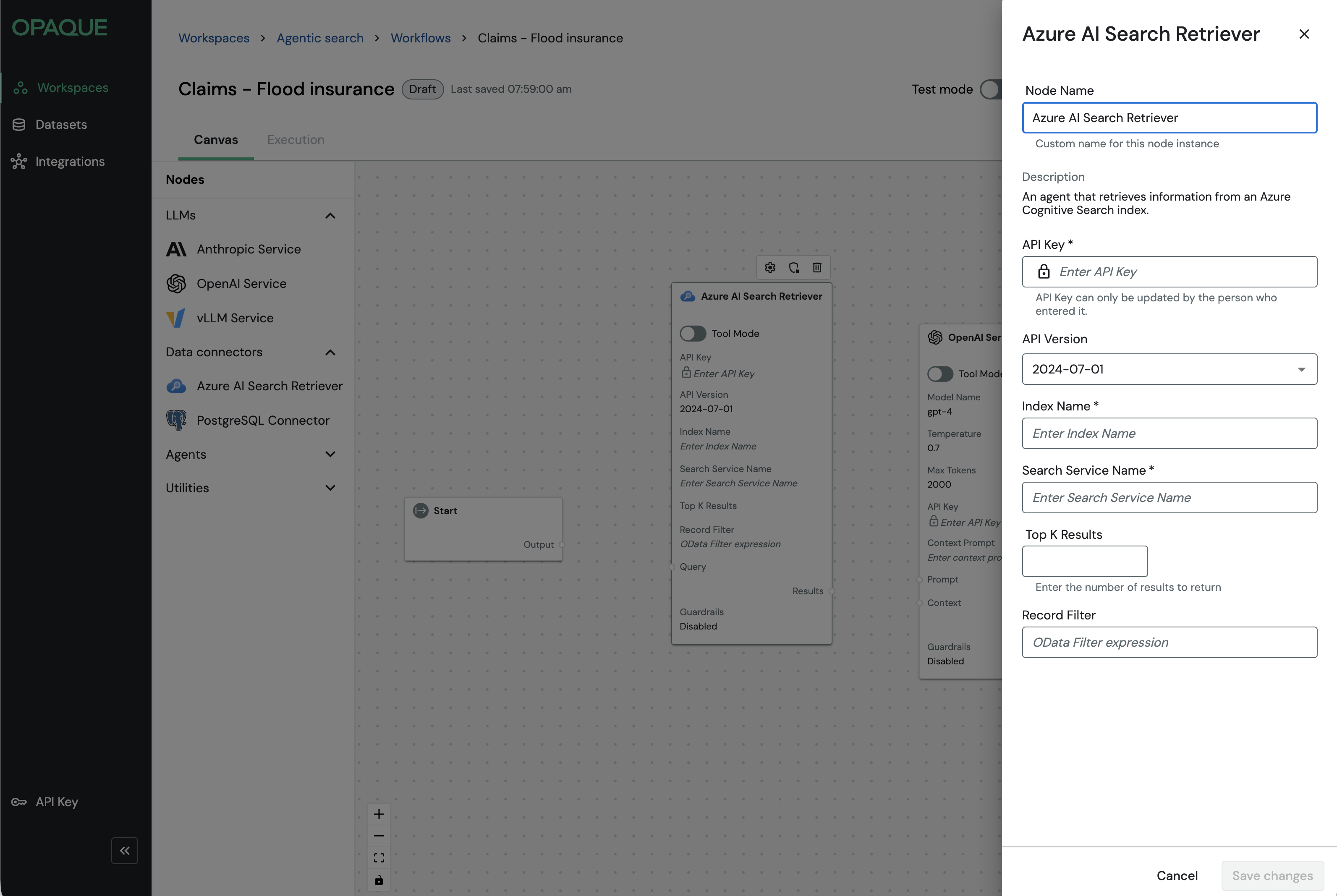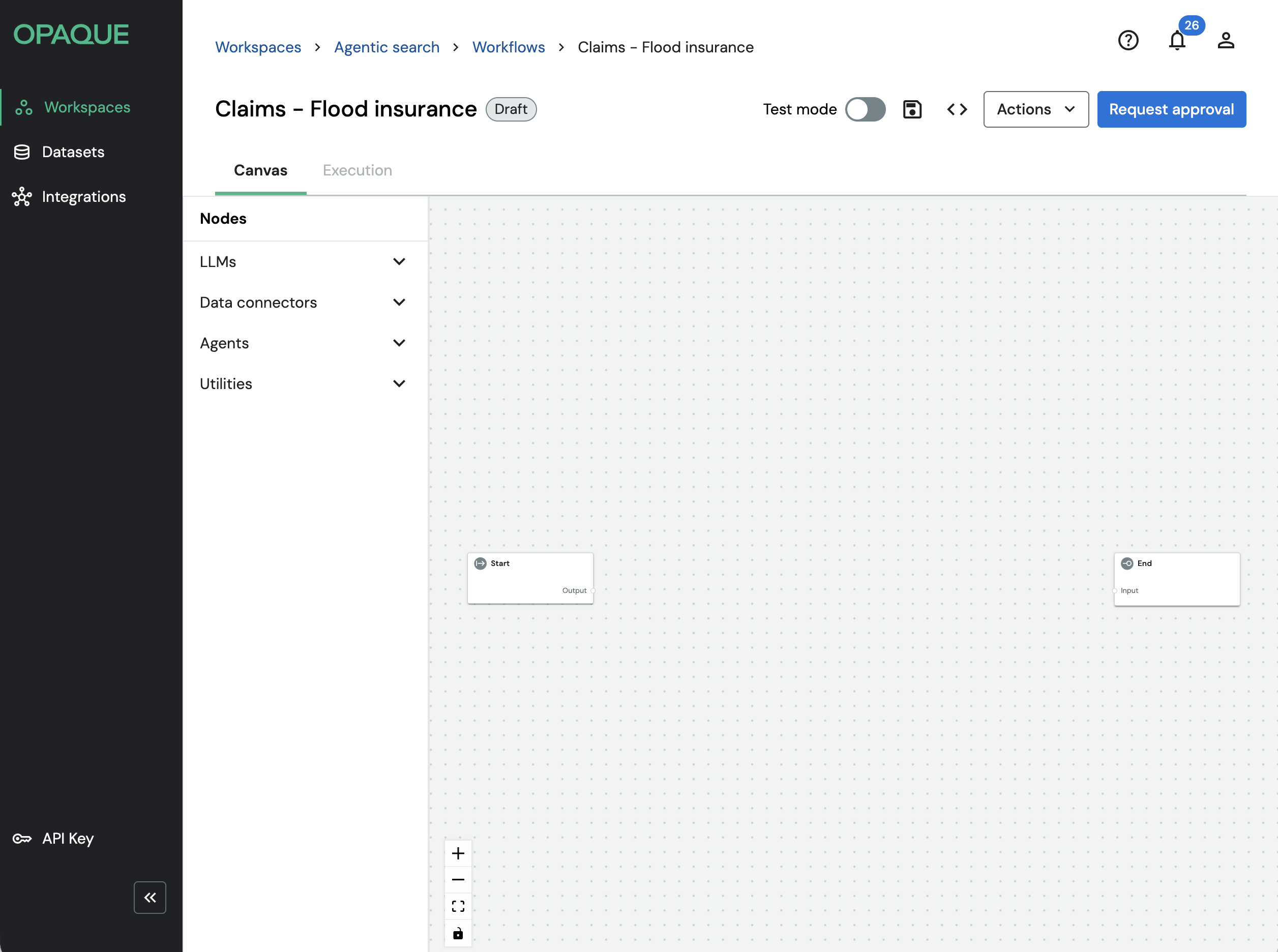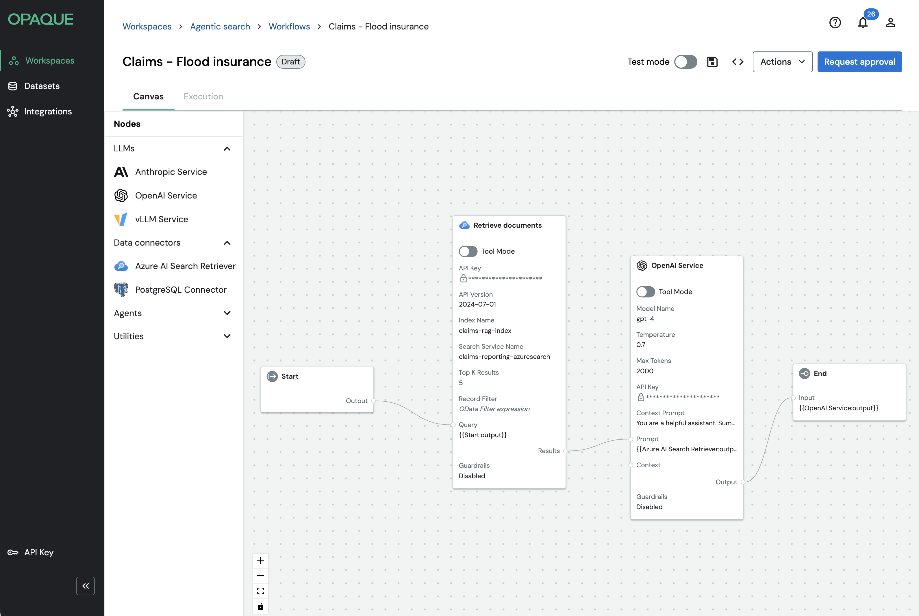 OPAQUE workflows also support test mode, which is designed for inspecting and iterating on workflows before running them in production. If you plan to inspect node-level inputs, outputs, or agent behavior, enable Test mode while in draft, before requesting approval. For more details on using test mode, see Using test mode.
