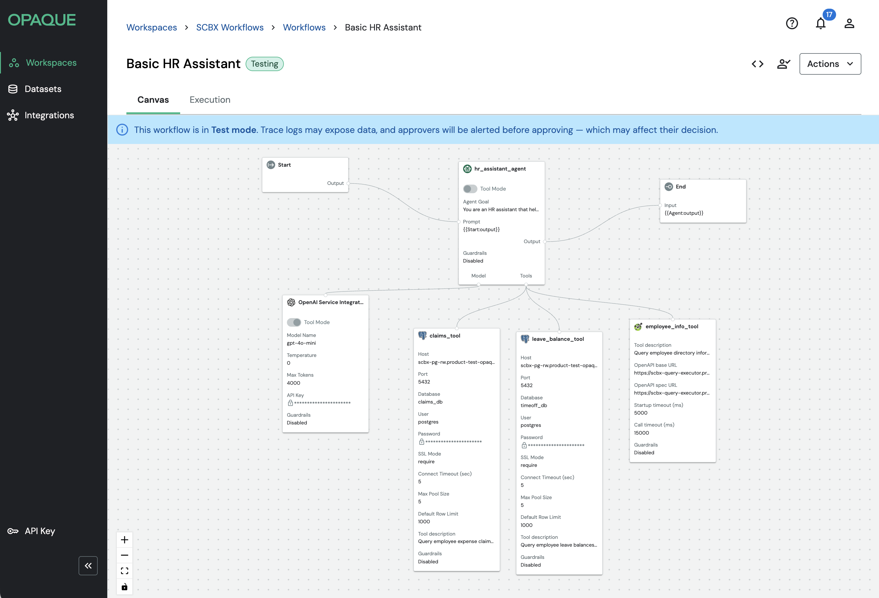 The following example shows a simple agentic workflow that answers questions about leave balances, claims, and employee directory information. It consists of: