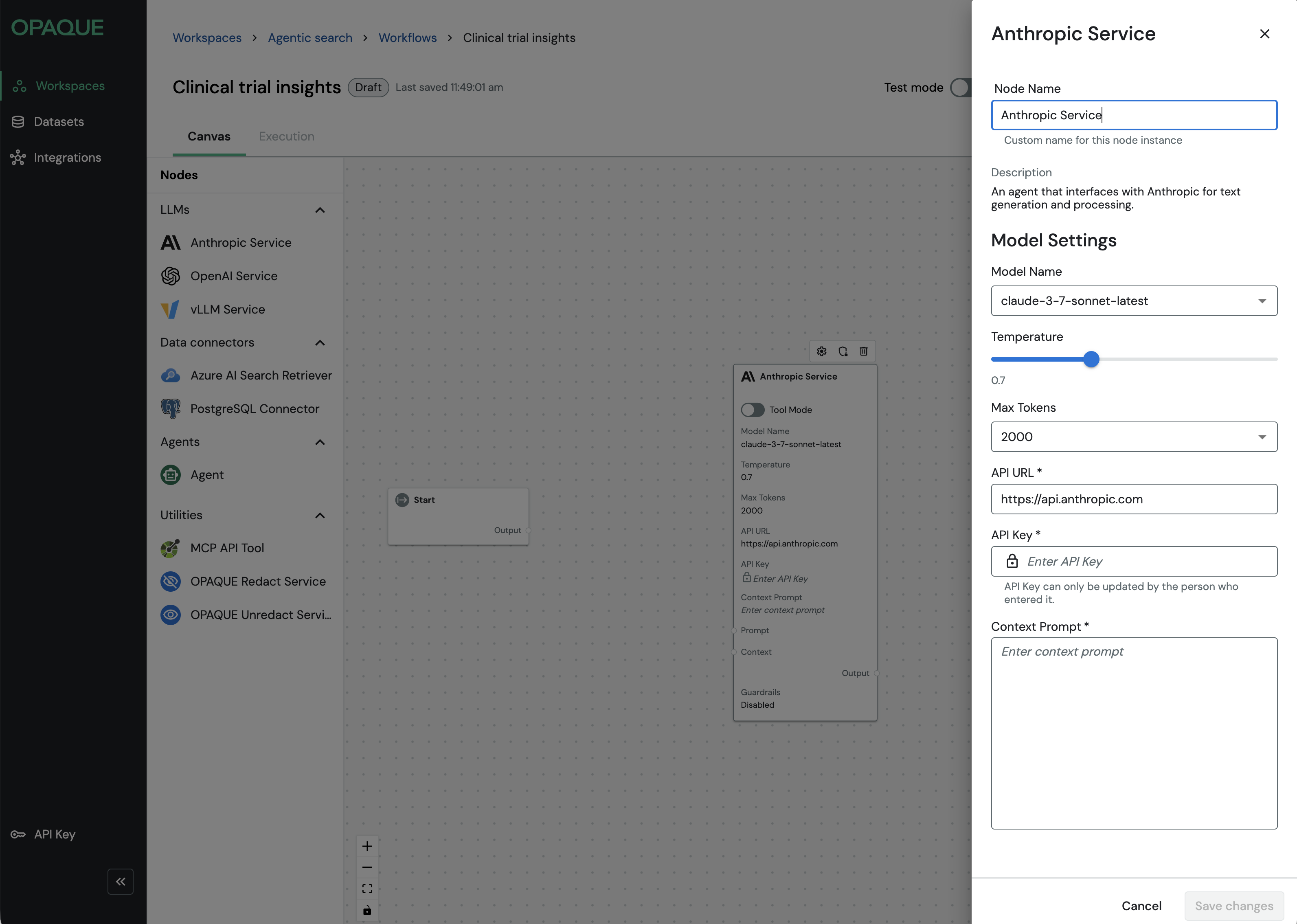 Whether you’re building a simple single-model workflow or a multi-step retrieval-augmented or agent-driven pipeline, every workflow in OPAQUE is composed of nodes like these.