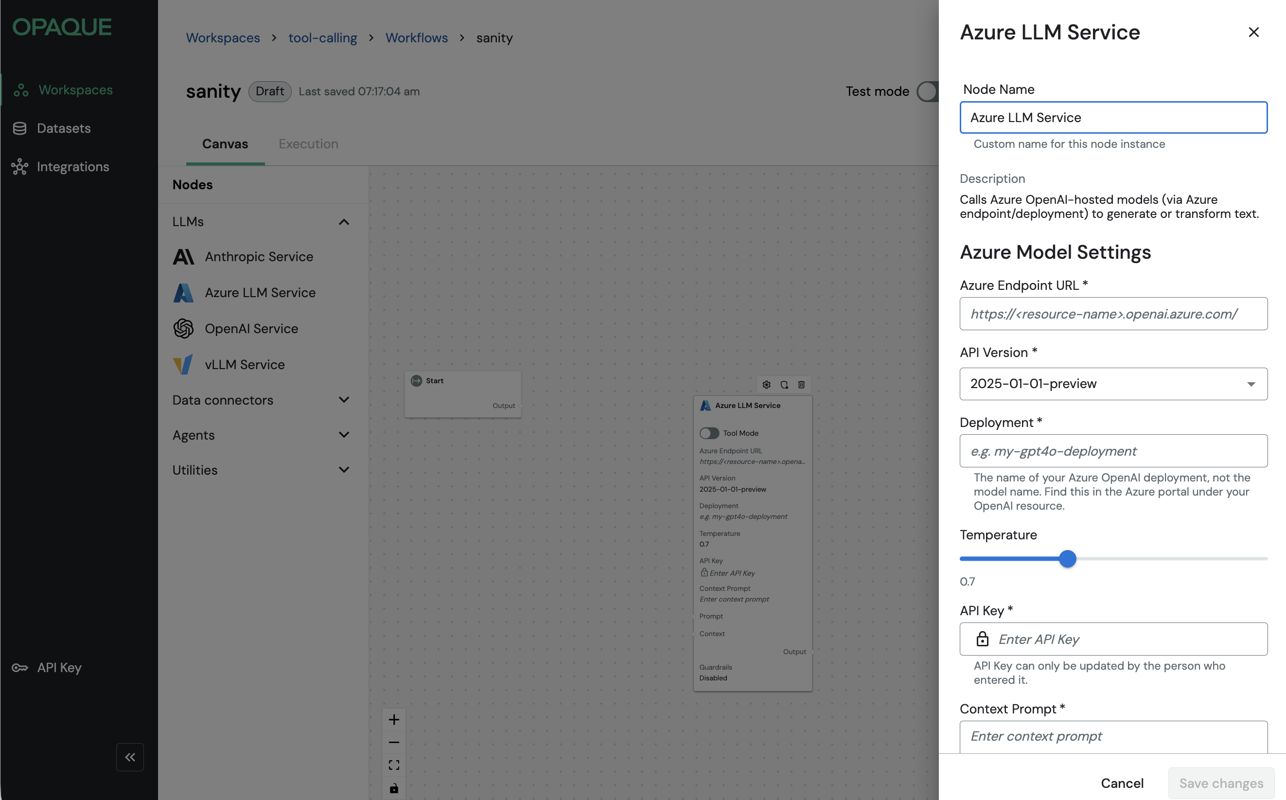 LLM nodes invoke large language models to generate, transform, or reason over text. These nodes are typically responsible for producing the final response returned by a workflow, but they can also be used at intermediate steps. LLM nodes are configured with prompts, parameters, and (optionally) guardrails that control how the model behaves during execution. OPAQUE currently provides the following LLM nodes: