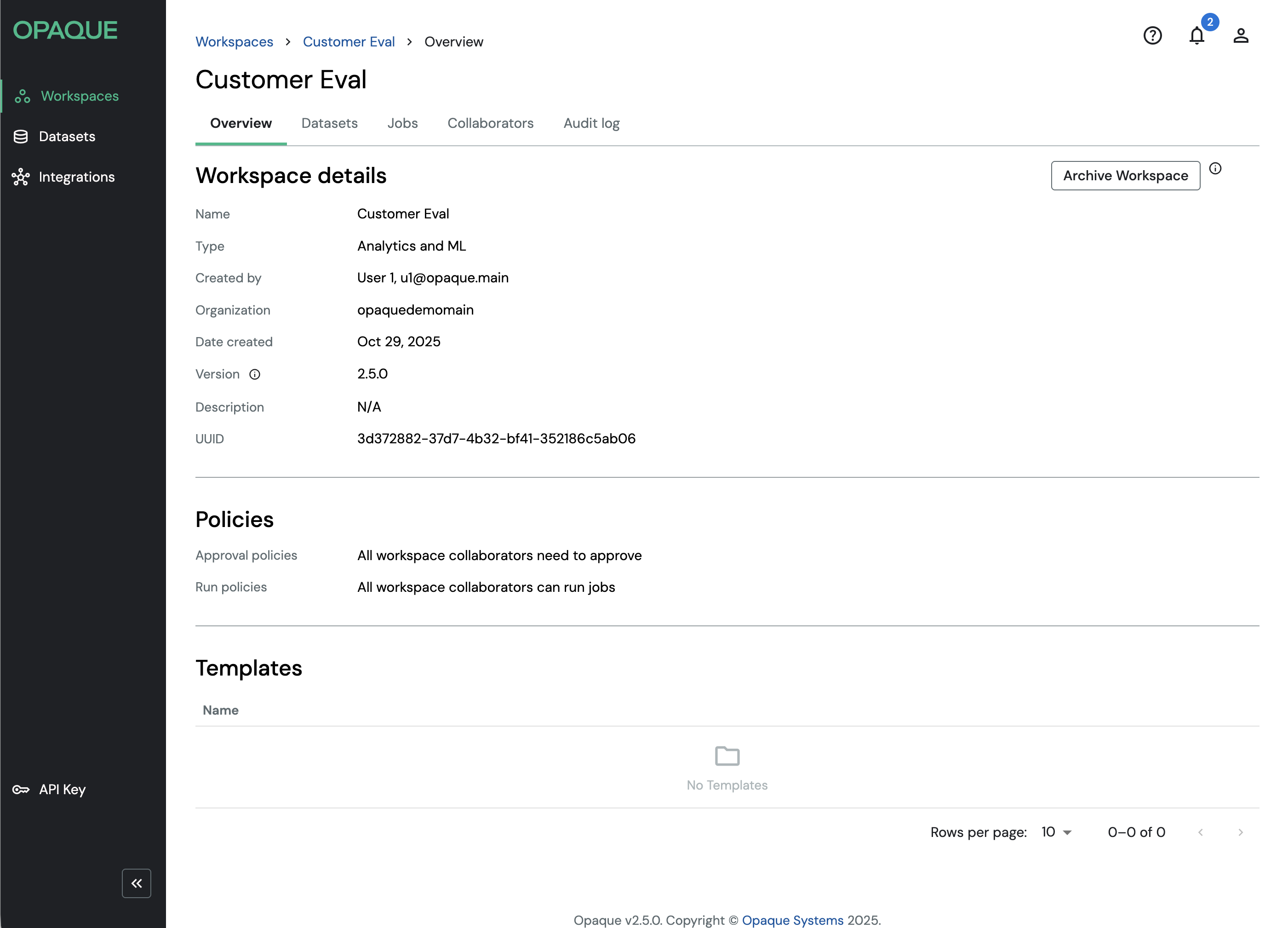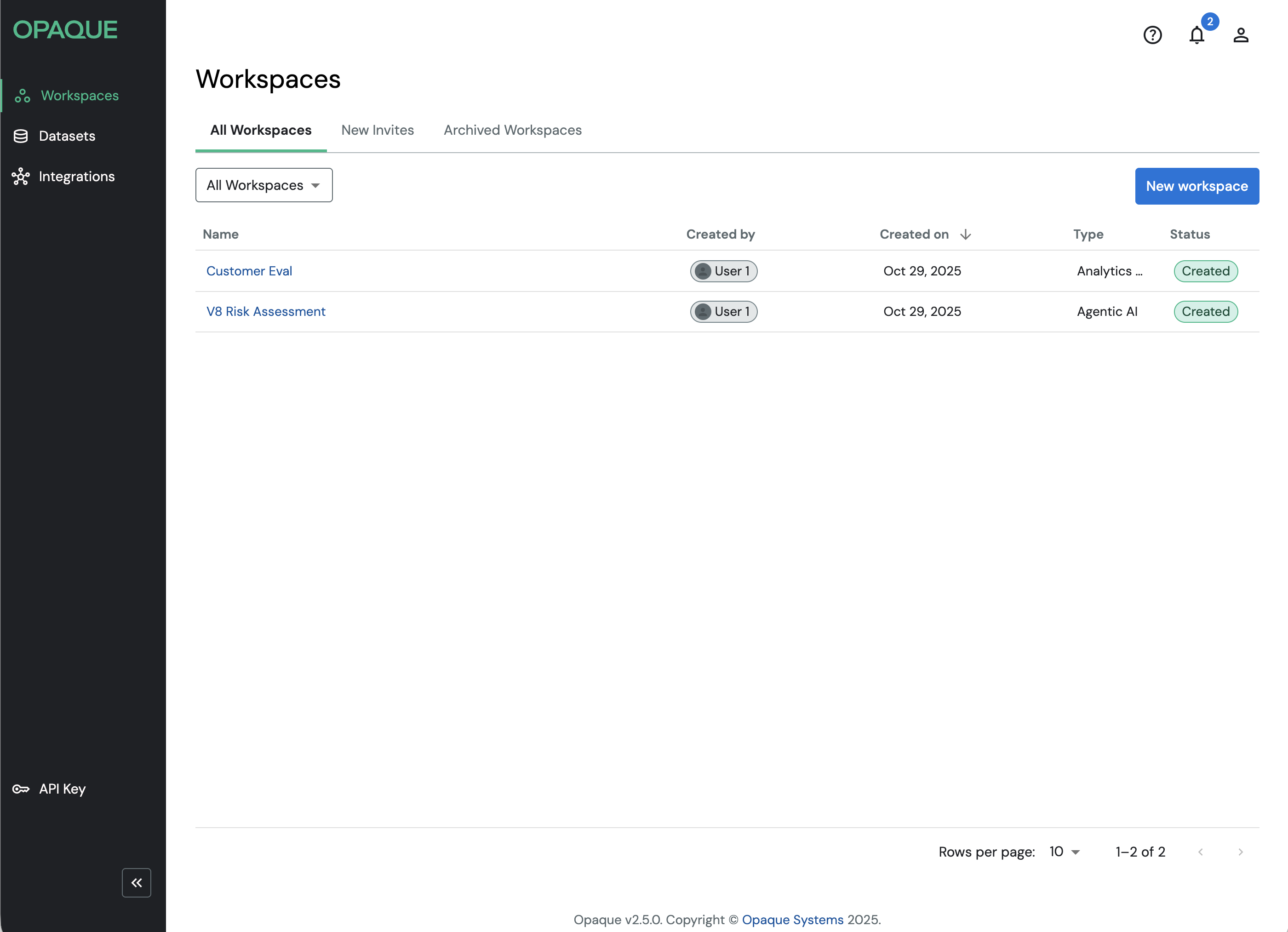 After signing in to OPAQUE, you’ll land on the Workspaces page.