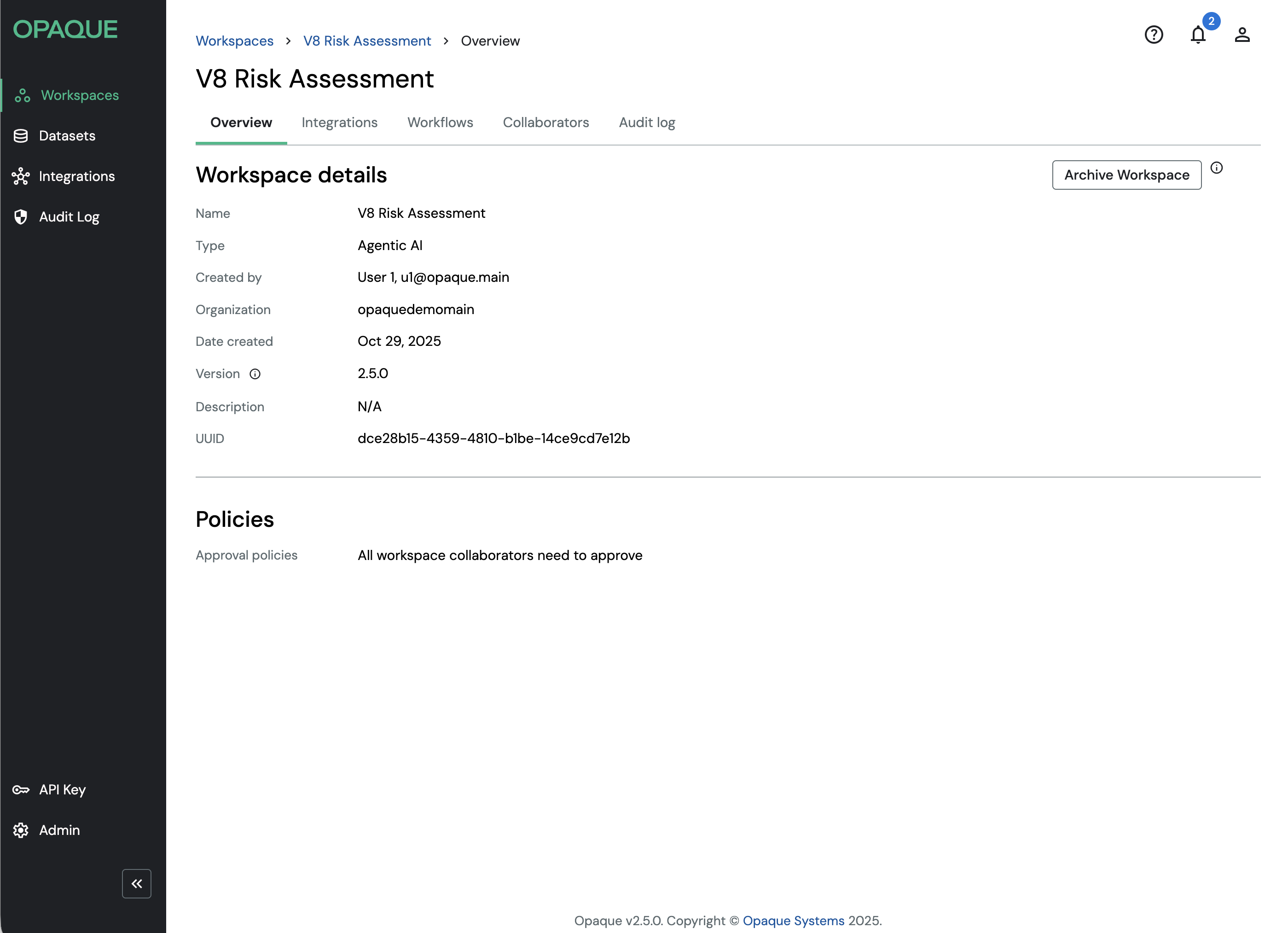 After signing in to OPAQUE, you’ll land on the Workspaces page.